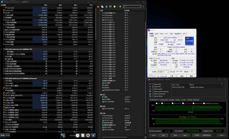CPU单烤十分钟,OMEN暗影精灵11搭载的Intel酷睿i9-14900HX处理器在烤机刚开始时,短时功率释放高达140W,约一分钟后稳定在90W的性能释放,温度稳定在约64度左右。