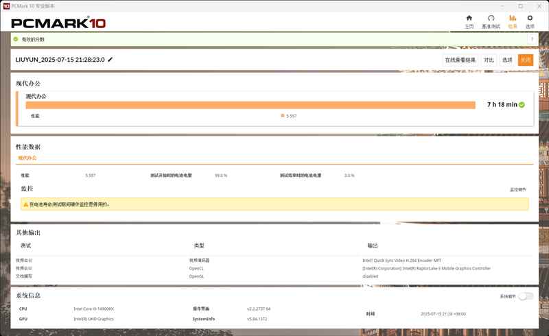 我们使用PCMark 10的现代办公模式进行续航测试,将电池充至99%,亮度调整为50%,测试结束时电量为3%,暗影精灵11笔记本最终测试成绩为7小时18分钟。