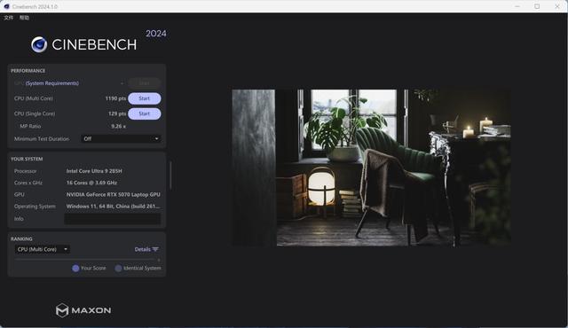 我们通过CINEBENCH 2024来看看这台机器的性能表现。在这个测试中,荣耀MagicBook Pro 16 2025 HUNTER取得129pts的单线程成绩和1190pts的多线程成绩。对比来看,酷睿Ultra 9 285H处理器的单线程性能超越酷睿i9-14900HX处理器(128pts),表现不错。