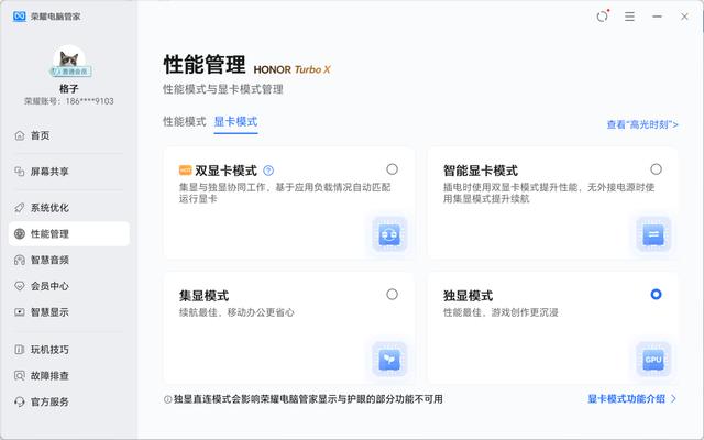 另外,这款GPU还集成最新的第五代Tensor Core和第四代RT Core,并支持DLSS 4,这使其在AI计算和光线追踪性能上取得了长足的进步。荣耀MagicBook Pro 16 2025 HUNTER支持动态双显三模,玩家可以在《荣耀电脑管家》中手动切换独显的输出模式,以满足不同的使用场景。