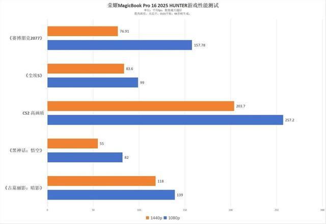 对于CS2这类热门电竞游戏而言,荣耀MagicBook Pro 16 2025 HUNTER的表现更是可以用“生猛”来形容。在1440p分辨率下,这台机器在CS2中的平均帧率能够轻松达到203.7fps,这为玩家提供了丝滑的操控体验。