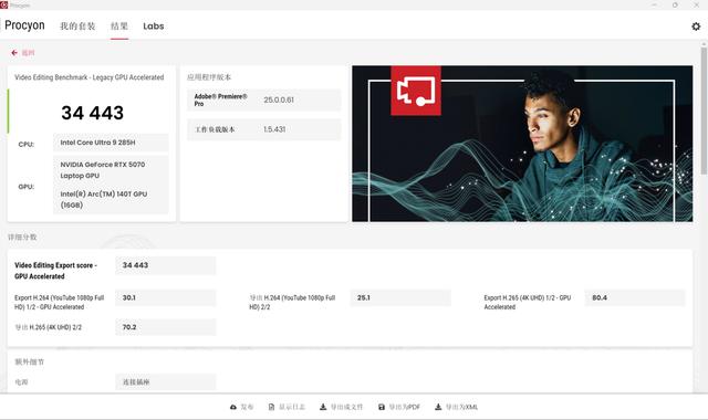 荣耀MagicBook Pro 16 2025 HUNTER不仅仅是一台游戏利器,更是一个高效的创意工作站。在UL Procyon视频编辑测试中,这台机器得到了34443的总分,意味着用它来进行视频剪辑是毫无问题的。在实际测试中,荣耀MagicBook Pro 16 2025 HUNTER剪辑4K视频时,回放没有出现卡顿和丢帧的现象,导出视频的效率也相当高。