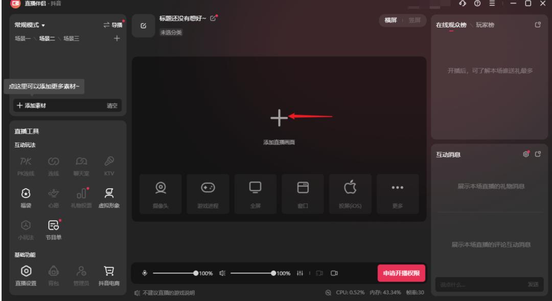 打开「抖音直播伴侣」软件→ 登录你抖音的账号 → 点击「添加直播画面」→ 摄像头功能,可以参考下图: