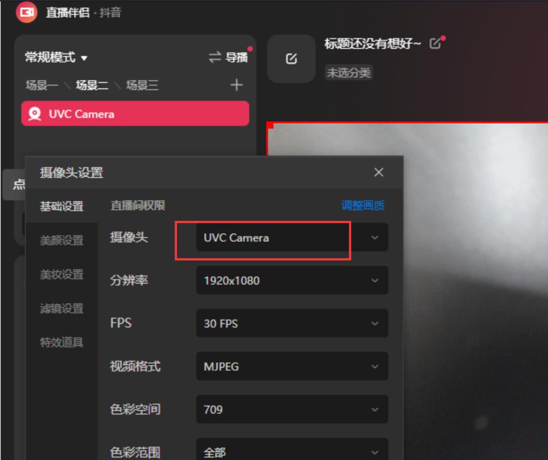 4、在摄像头设置功能中,选择 UVC Camera,可以参考下图,软件上显示设备拍摄的画面,再点击“开始直播”,即OK开始直播啦: