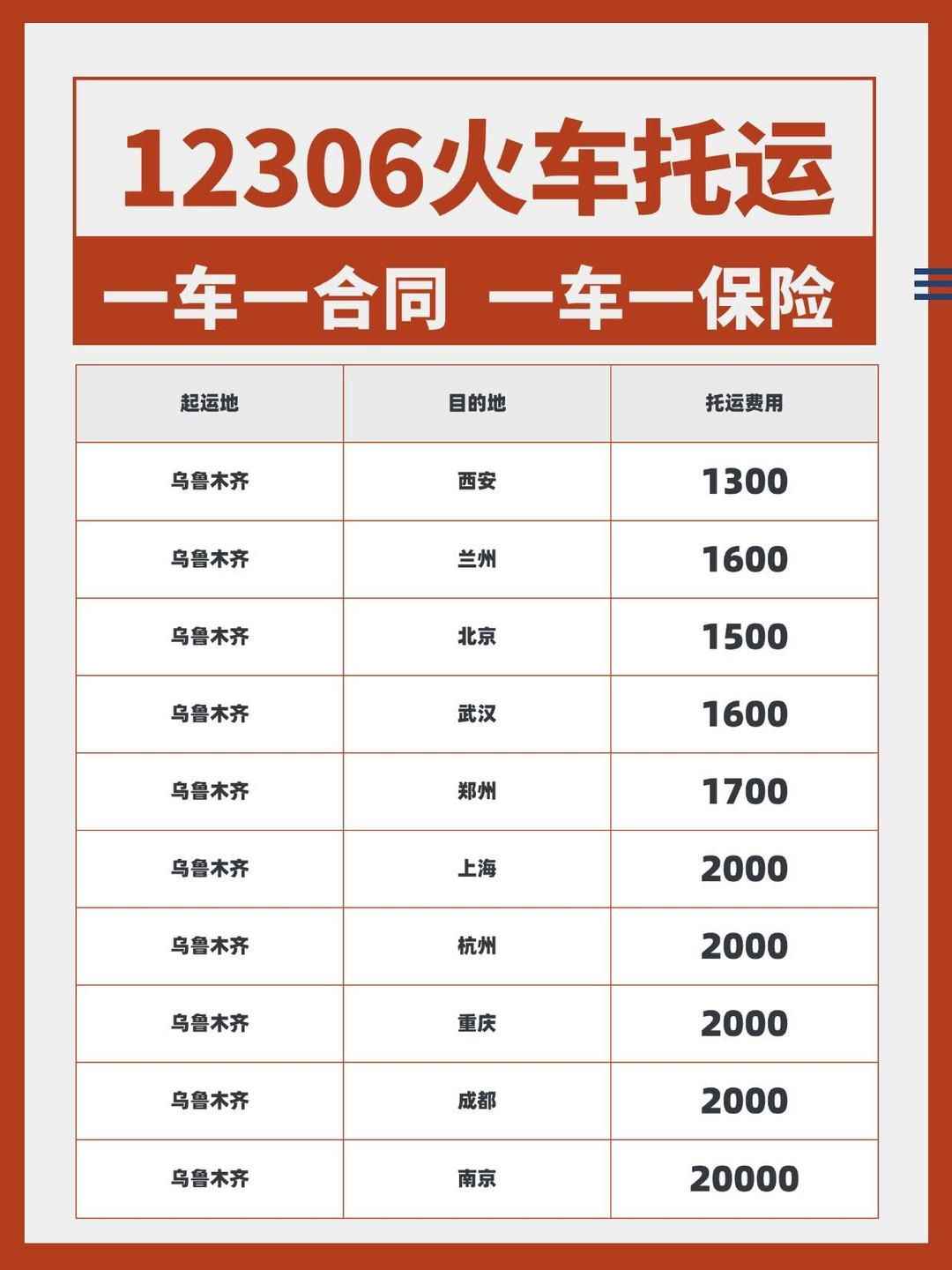 最近研究了一下12306新疆汽车托运的价格表,发现原来新疆的汽车托运这么划算!算下来差不多5毛钱一公里,不托运简直是大冤种啊!给大家列几个热门路线的价格参考: