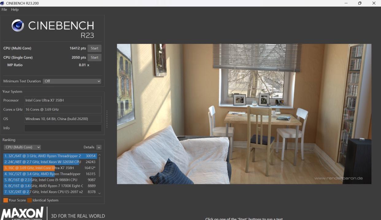 ⬆均衡模式,Cinebench R23多核16412分;单核2050分
