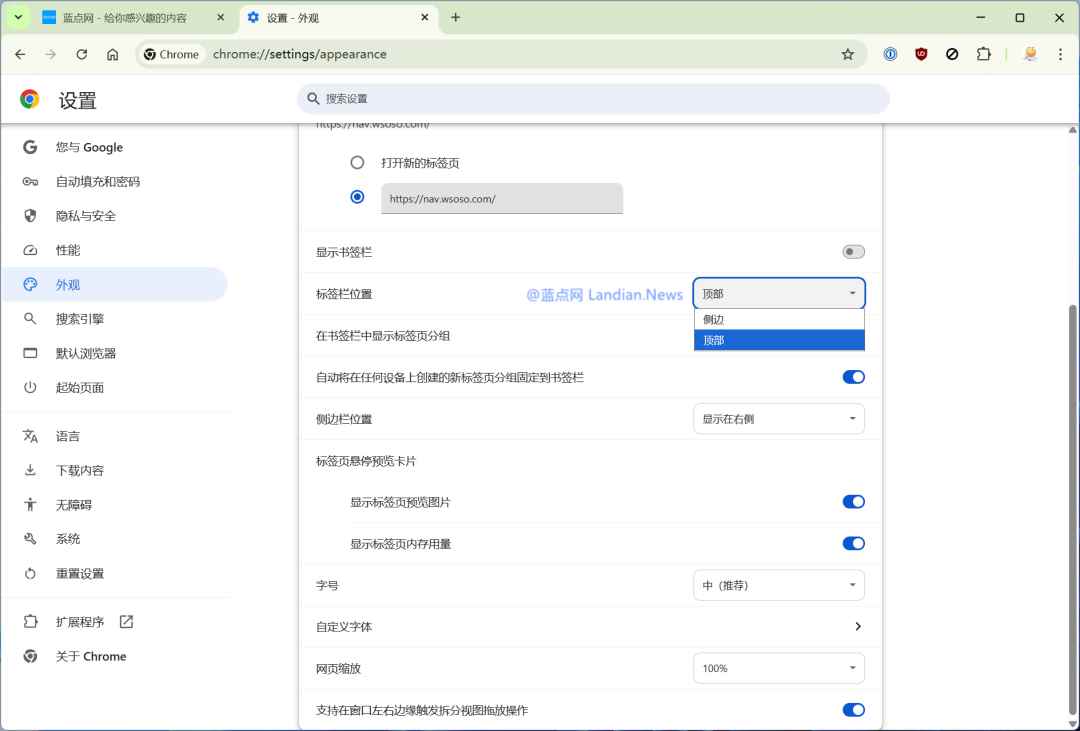3. 更改设置:转到谷歌浏览器设置、外观、标签栏位置、侧边 (目前仅支持通过设置调整)
