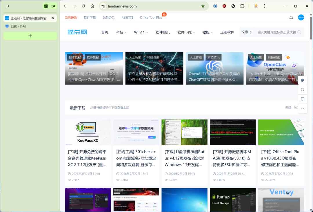 垂直标签栏指的是将原本在顶部的标签栏放到侧边显示,这样用户打开多个选项卡时不至于顶部被塞满导致看不清标题,而在垂直侧边栏中用户可以拖动侧边栏间距实现完整显示标题,如果启用的页面非常多侧边栏排满后就需要向下滚动查看。