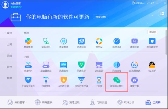 安装完成之后,再次点击会有一个如图的提示,告诉你可以在微信电脑版中进行聊天记录备份,但是我们不需要,所以直接点击【继续使用电脑管家】;