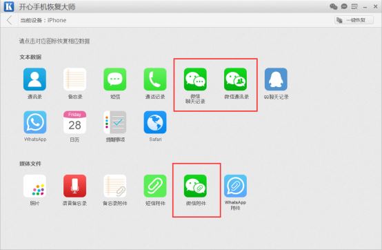 下载一个【开心手机恢复大师】,把iPhone连接到电脑上之后,运行软件,根据提示点击【开始】之后,你可以选择备份微信文字记录或者微信图片;