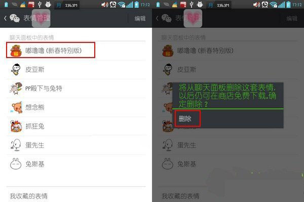 第二步、如果想要删除一个表情包,我们需要长按表情包,在弹出的询问框中点击“删除”即可。