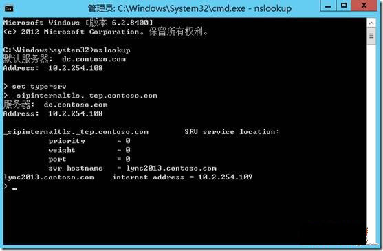 完成后,测试创建的记录是否正确。在任意一台服务器或域内客户端上运行命令提示符,设置正确后结果如下: