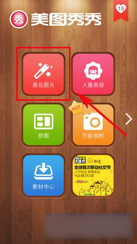 1)首先,打开美图秀秀进入(点击下载),然后点击【美化图片】,选择自己需要P的图片,接着把下面的工具栏往左拨动。(如下图所示)