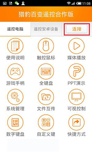 第三步:完成后,在手机中打开猎豹免费WiFi遥控APP,然后“点击连接电脑”,如下图所示: