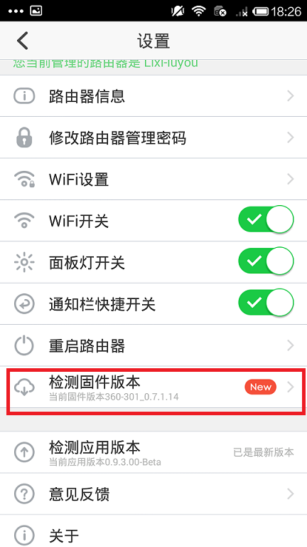 360安全路由系统ROM升级方法:1)手机APP端升级方法:点击设置—检测固件版本,如下图: