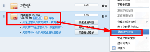在迅雷的下载列表内,我们可以右键获取当前的磁力链接,如下图所示: