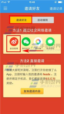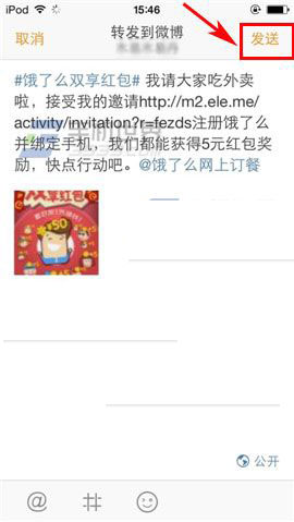 2)邀请好友有两种方法,这里小编以【新浪微博】为例,点击【新浪微博】,页面跳转后话题框内已经自动生成一段话,亲们也可加上自己想说的话语,然后点击右上角【发送】就可以了哦。(如下图)