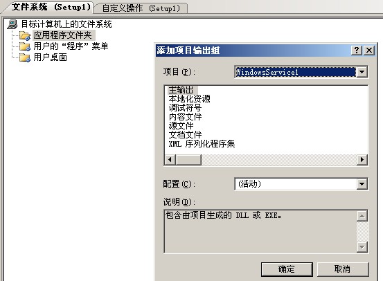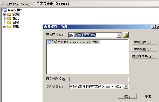 上面有两点需要注意 ,一 项目选择中选择要安装的服务, 二 项目选择下面要选择主输出,选择好后确定,这一步增加了安装程序的文件夹,下一步就是给这个安装程序增加操作,这里我们增加两个基本操作,一个是安装,一个是卸载。安装项目(右击) ——> 视图 ——> 自定义操作 如图