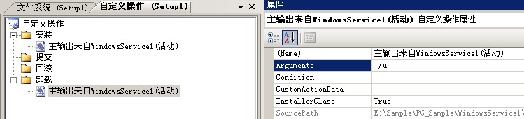 这里 Arguments 里输入 /u 表示卸载命令相当于 InstallUtil.exe /u 服务路径 , 到这里 ,我们的安装程序就已经制作好了,生成安装程序项目,将会生成 setup.exe 和 setup.msi 安装文件,拷贝到客户端,点击setup.exe 就像安装QQ一样安装我们的服务,实际上比QQ好多了,QQ还有广告,我们可是纯绿色的!