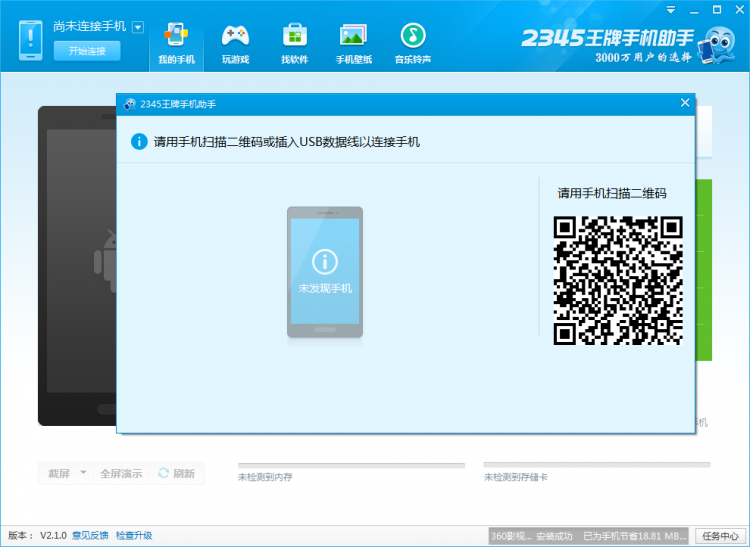 手机与2345手机助手电脑版连接的方式有两种:①数据线连接 ② wifi 连接