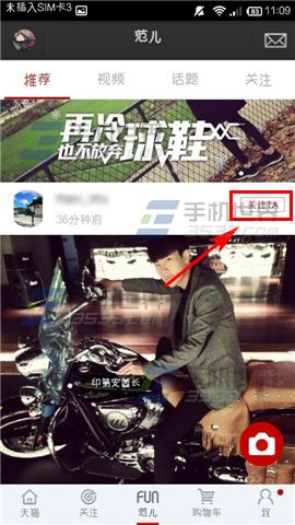 1)打开手机天猫,点击【范儿】,看到哪个小伙伴的动态很合自己的“胃口”他(她)的头像右边有【关注TA】的按钮哦。(如下图)