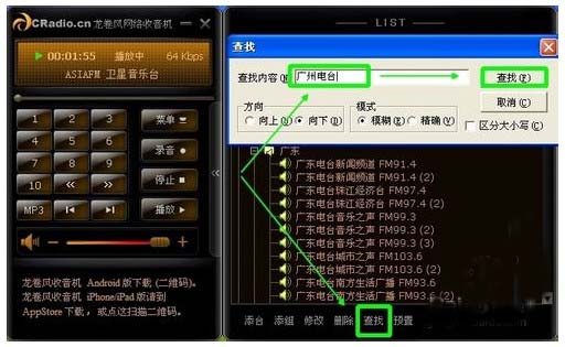 一、在版面底部点击“查找”然后输入“关键词”来查找其他的台电或歌曲名,因为列表实在是太多台电和类目了,一个个翻看也费时间。