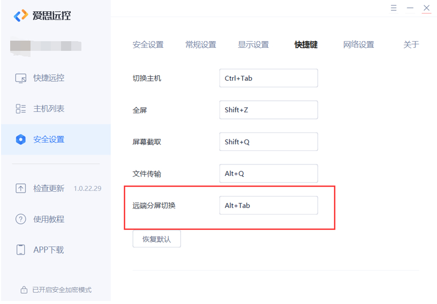 三:进入爱思远控的安全设置-快捷键,自行设定后即可使用快捷键进行多屏切换。