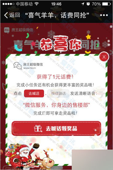 房王网在微信上举办的一次活动,全称为喜气洋洋话费同抢,目前我们通过微信关注房王网,然后参加话费同抢活动就100%可得1到100元手机话费,当然,估计大多数朋友会得到1元手机话费,部落获得的就是一元.