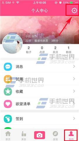 1)首先打开美妆心得,点击【我的】,然后在右上方点击【设置图标】。(如下图)