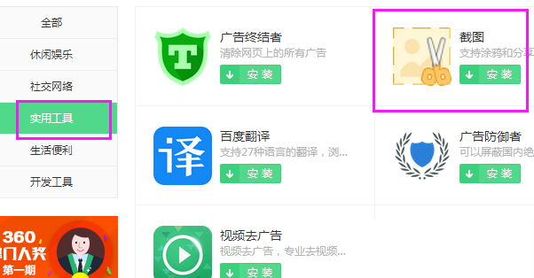 4、进入全部分类后,再左侧的分类栏目中,找到实用工具,里面有个截图工具,点击安装。