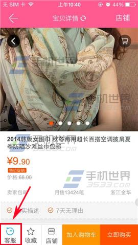1)首先打开9块9包邮购,在界面选择要查看的商品点击进入,进入界面在左下方点击【客服】。(如下图)