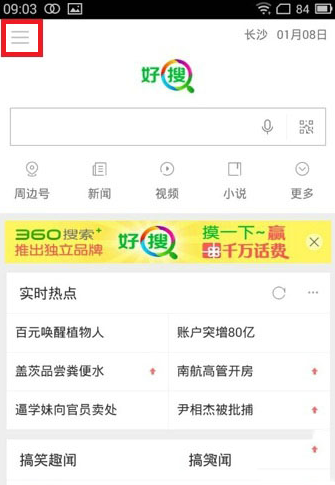 好搜送话费怎么领?好搜免费话费活动地址 1、进入好搜之后,点击左上角的按钮。