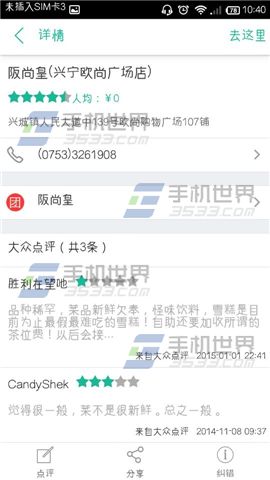 3)进入到导航,点击下方的店铺名称,进入到详情页面,这里可以看到【团购】信息,也可以【点评】美食。(如下图)
