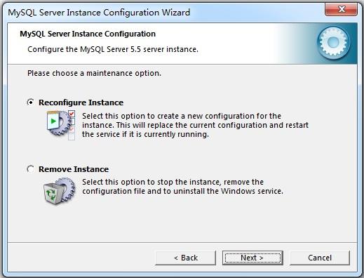 如果MySQL Configuration Wizard(配置向导)检查到my.ini文件,你可以选择重新配置已有的服务器,或通过删除my.ini文件并停止、卸载MySQL服务来卸载服务器实例。