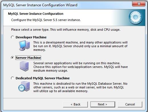 可以选择3种服务器类型,选择哪种服务器将影响到MySQL Configuration Wizard(配置向导)对内存、硬盘和过程或使用的决策。
