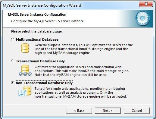 3)Non-Transactional Database Only(只是非事务处理数据库):该选项完全禁用InnoDB储存引擎,将所有服务器资源指派给MyISAM储存引擎。建议不使用InnoDB的用户选择该选项。