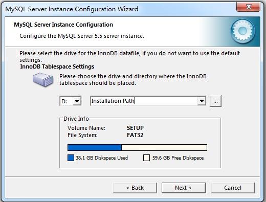 1)要想更改InnoDB表空间文件的默认位置,从驱动器下拉列表选择一个新的驱动器,并从路径下拉列表选择新的路径。要想创建路径,点击 ...按钮。