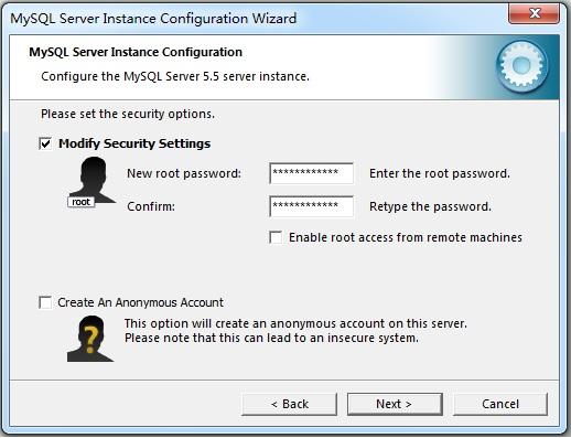 3)要想防止通过网络以root登录,不要选中Enable root access from remote machines(允许通过root远程登录数据库)选项旁边的框。这样可以提高root账户的安全。