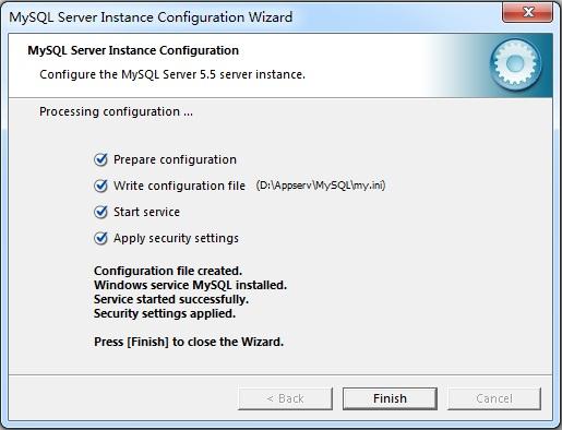 3)如果选择为MySQL服务器创建一个服务,则创建并启动服务。如果你重新配置已有的服务,则根据你的配置更改重新启动服务。