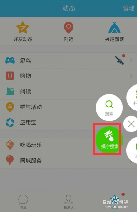 单击之后会弹出几个选项供我们选择,我们用手单击“摸字搜索”,然后用手将该选项按顺时针方向往上拉。