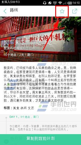 1)打开出发吧,选择一个路线点击进去,在路线的详情页面右上角有个【星星】的按钮,点击它即可收藏成功。(如下图)