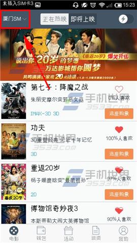 1)打开【万达电影】app,点击左上角的【选择城市】。(如下图)