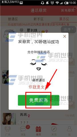 2)然后点击右上角的【发布悬赏】,跳出的提示框上有【免费发布】的按钮,点击它即可。(如下图)