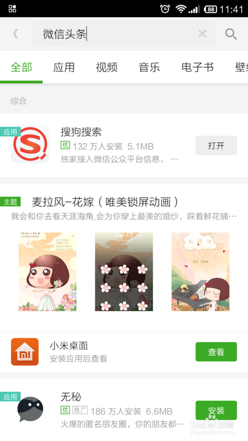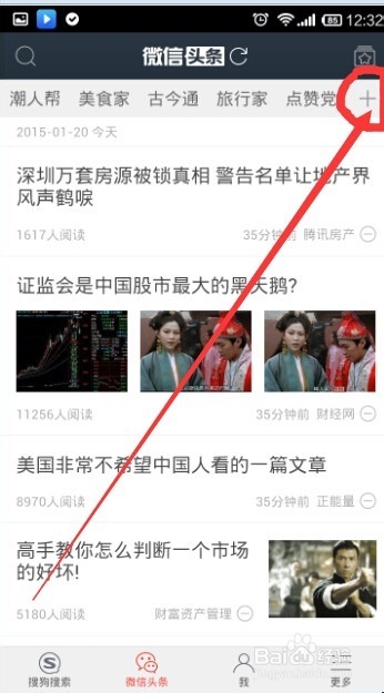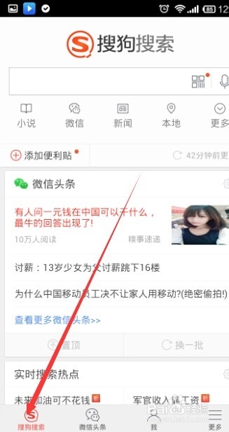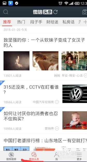 1、要想更好地使用微信头条,手机上首先要有搜狗搜索客户端,大多数朋友的手机上应该都会有,小编是第一次使用,所以从头至尾的跟大家分享。首先搜索微信头条就会出现搜狗搜索客户端,下载安装。安装完成后手机上搜狗搜索和微信头条都存在了,实际上从哪一个进去页面都是一样的。点击进入。