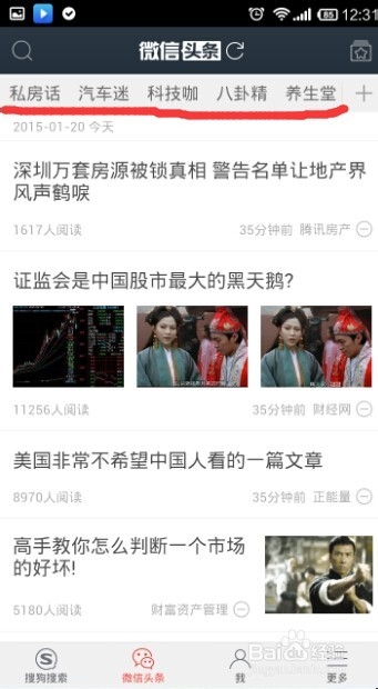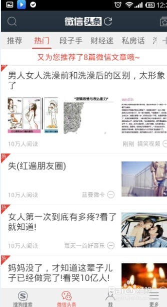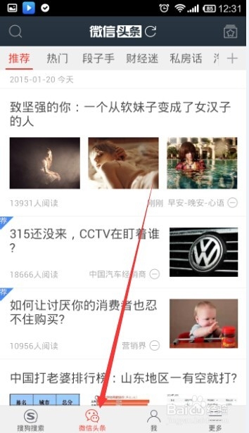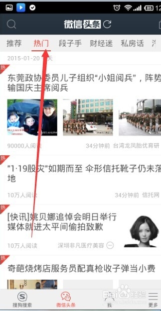 4、这时就进入了微信头条,下面除了“微信头条“之外还有搜狗搜索。但是在微信头条最上面会看到有两个红色的字体,”推荐“,这时微信头条筛选之后推荐给我们的,旁边还有”热门“,这是当前最热门的头条,当然在往左看的话,就是一些其他的筛选条件,点击一项,就能筛选出这一项中的头条。