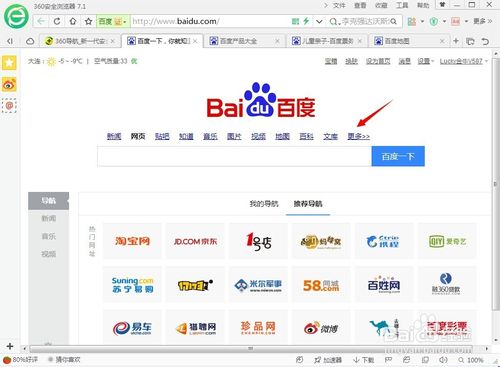 1、在你的电脑浏览器中输入百度网址进入百度的首页页面,在百度LOGO的下方,有一行菜单,没有显示全,点击最右面的“更多”菜单,如图所示。