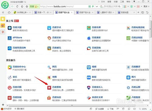 2、点击“更多”以后,出现很多服务项目,在“搜索服务”项目下,有一个“百度票务”的菜单,点击它,如图所示。