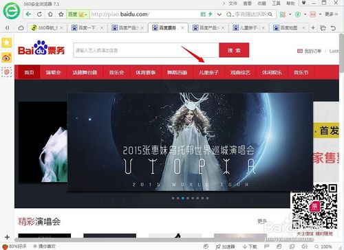 3、页面出现了一行红色的菜单,有很多演出的类型,我们可以根据我们的需要选择,比如选择“儿童亲子”一项,如图所示。