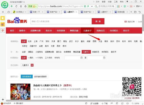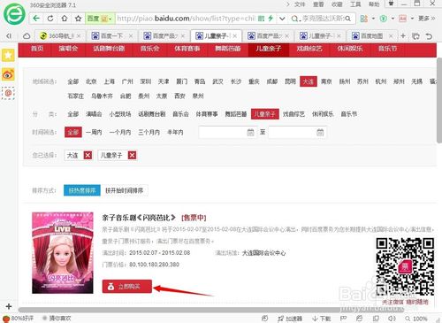 4、选择类型以后,在选择你所在的城市,比如“大连”,这时,所有在大连的演出就出现在页面的下方,如图所示。