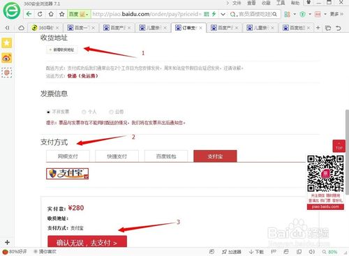 7、在下一个画面上,输入收货地址,选择你想要的支付方式,再点击“确认无误,去支付”按钮,支付成功即可。